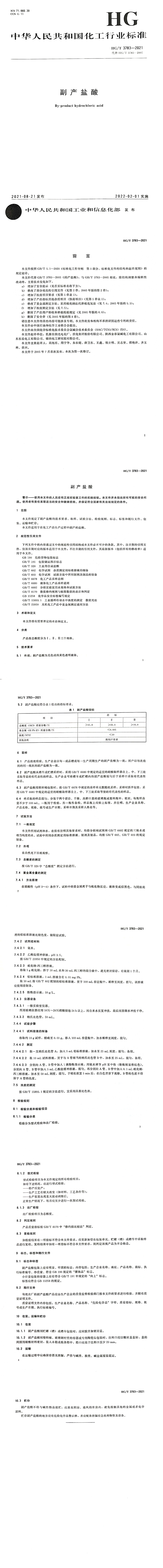 HG/T 3783-2021《副產鹽酸》,已于2021年8月21經國家工業和信息化部發布,并已于2022年2月1日起實施。
